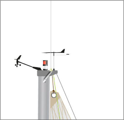 Windgeber, Windex, UKW-Antenne, Dreifarbenlaterne – zur Navigation.