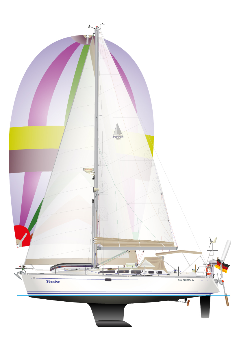 Die Riss-Graphik zeigt eine digitale Darstellung der JEANNEAU SUN ODYSSEY 43 in Seitenansicht. Sie ist maßstabgerecht und berücksichtigt eine individuelle Ausstattung wie Farben, Segel, Elektronik. Das macht die Graphik zu einem Portrait Ihres Schiffes, mit dem Sie vielleicht mehrere Jahre auf unvergesslichen Törns unterwegs waren. Mit anderen Worten: Sie erhalten ein  Kunstwerk mit großem Erinnerungswert.